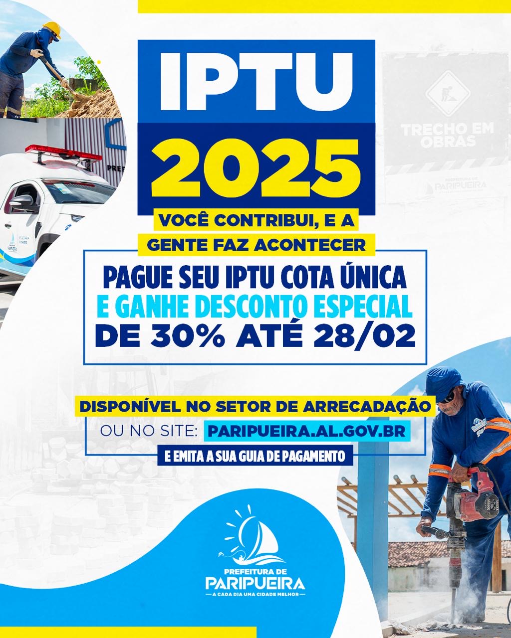 A Prefeitura de Paripueira anunciou a concessão de um desconto de 30% no pagamento do IPTU 2025 para os contribuintes que optarem pela quitação em cota única até o dia 28 de fevereiro. O benefício está disponível tanto para imóveis residenciais quanto comerciais.