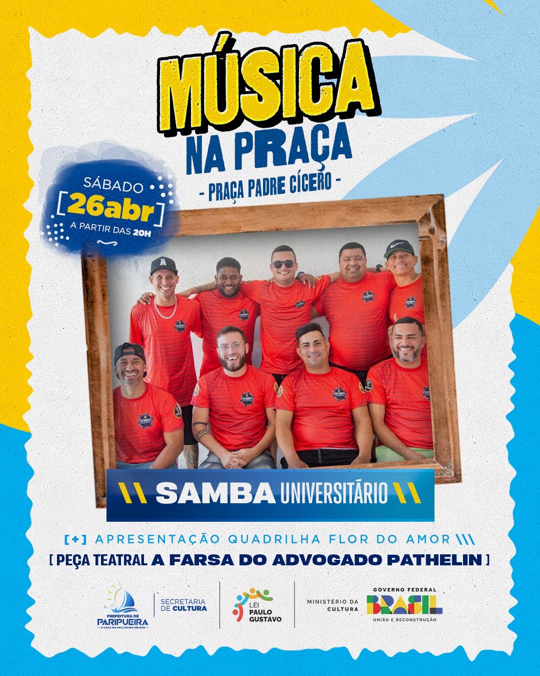 Música na Praça deste sábado (26) traz quadrilha, teatro e samba em Paripueira