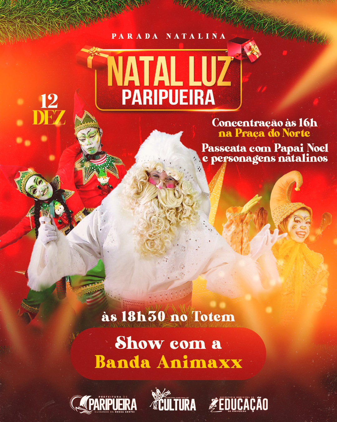 A programação do Natal Luz terá início às 16h, com a concentração na Praça do Norte. Onde o Papai Noel será recebido com muita alegria. Logo em seguida o bom velhinho, acompanhado de vários personagens natalinos, vai realizar uma passeata até a Orla do Município.