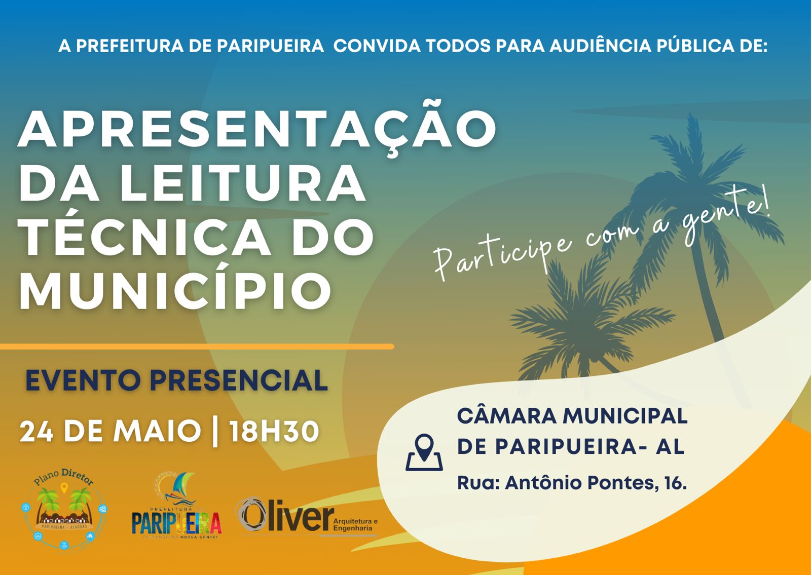 A confcção do Plano Diretor da cidade está avançando. Mais uma etapa será cumprida no dia 24/05/2022, com a leitura técnica do município. Será na Câmada de Vereadores, a partir das 18:30.