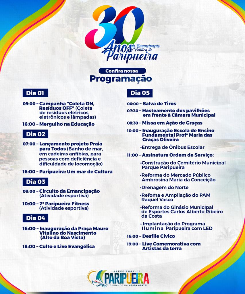 A Prefeitura de Paripueira vai realizar duas vidas para comemorar os 30 anos de Emancipação Política do município.